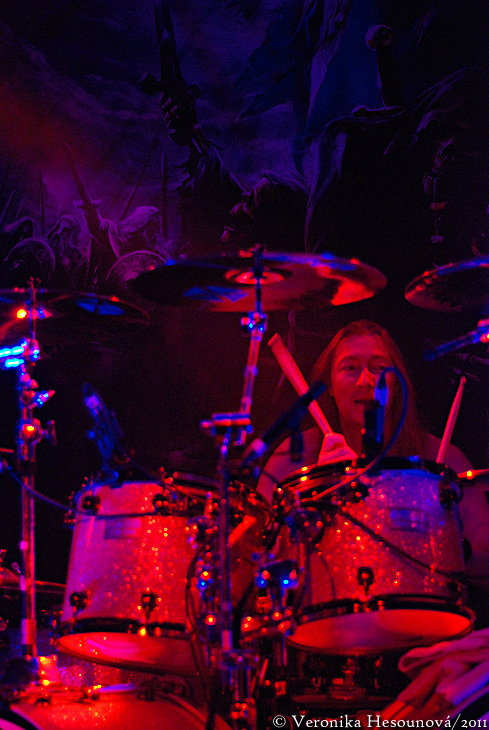 Randal je klub, který zrovna volným místem nepřekypuje. Navíc ani pódium se nedá nazvat rozměrným a tak mě celkem zajímalo, jak se kapely naskládají. Nakonec se potvrdilo, že rozměry pódia byly skutečně na úkor kompletní show, ale ještě malinko víc zamrzel mizerný zvuk. A to především při prvních Orden Ogan, kteří celý večer otevírali, jelikož jsme (naštěstí) byli ušetřeni nějaké místní předkapely. Tyhle Němce znám skutečně krátce, ale mají na kontě už tři alba a z desek se mi jejich hudba moc líbí. Vzhledem k tomu, že jejich styl je hodně pompézní a hlavní roli hrají mohutné sborové refrény, celkem mě zajímalo, jak se s tím na živo kapela popasuje. Bohužel všechno naprosto zabil zvuk. Rozhodně by mi byly milejší předtočené sbory, protože i když se zpěvák Seeb a klávesák Nils mohli při svém snažení přetrhnout, vokální linky vyznívaly ploše a celý efekt jejich hudby trochu zanikal. Měla jsem ale tušení, že nebýt toho zvuku, tak by se mi to líbilo (což se potvrdilo o den později ve Zlíně). Kapela během zhruba pětačtyřicetiminutového setu odehrála skladby ze všech tří alb – zazněly „Angels War“, „To New Shores of Sadness“, „Farewell“, „Welcome Liberty“ nebo „We Are Pirates“, která vám nemůže neevokovat piráty Alestorm. I když publikum nebylo úplně početné a aktivitou taky nehýřilo, usměvavý Seeb se snažil ho trochu rozproudit a s velkým ohlasem se setkal rituál kapely, kdy po nás frontman chtěl, abychom na jeho „Hello my friends“ odpovídali zdviženým prostředníčkem a hláškou: „Fuck you pussy!“. Je třeba zmínit ještě jednoho z náhradníků – za bicí totiž usedl bubeník Van Canto Bastian Emig a ačkoli měl k dispozici jen základní sestavu, předváděl za ní neskutečné věci. Už jsem naznačila, že ve Zlíně to celé byla jiná káva, protože tenhle večer s tím kapela musela vyloženě bojovat – ale to už patří do jiného reportu.