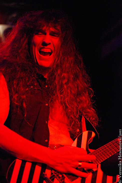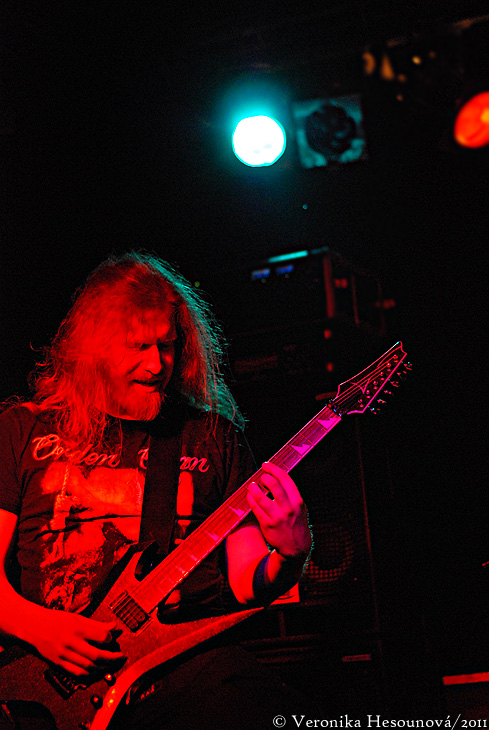 V Bratislavě se pódium během chvíle připravilo pro Grave Digger. Den poté jsem se ale mohla přesvědčit, že velká většina vybavení pódia chyběla a show byla celkově oklešťená. Chris ani na první polovinu nepřišel zpívat v kiltu, což jsem podle fotek z předchozích koncertů čekala. Teď už docela slušně zaplněný klub ale nebyl ochuzen o majestátní úvod, kdy klávesák HP v typické masce smrti nakráčel na pódium s dudami. To odstartovalo dvouhodinou smršť, která se z pódia valila s obrovskou intenzitou prakticky bez možnosti nádechu. Nevím, jak to ta kapela po tolika letech dělá, ale takhle já si představuju výkon na sto procent po všech stránkách. Setlist musel potěšit každého – jedná se totiž o ideální kombinaci průřezu diskografie (povinné hity plus sem tam něco netradičního) a prezentace nového materiálu. Nechyběly věci úplně nejstarší („Yesterday“) a ani z alb novějších (potěšila mě „The Last Supper“). I přes ne úplně ideální zvuk bylo jasně slyšet, že Chris za mikrofonem předvádí dokonalý výkon a to doslova. Kapela má hromadu energie, nový kytarista Axel Ritt předváděl kytarovou exhibici, kterou publikum hlasitě oceňovalo (měl tam očividně pár skalních fanoušků) a za velkou pozornost stojí také styl bubeníka Stefana Arnolda, který se nenechal předchůdcem z Van Canto nijak zahanbit a i on předvedl velmi efektně vypadající hru na bicí plnou parádiček. Publikum bylo ve varu hned u prvních tónů a přišlo mi, že nové skladby jsou přijímány stejně nadšeně, jako ty klasické. Samozřejmě jen těžko mohlo něco překonat sborový zpěv refrénu „Rebellion“ nebo „The Round Table“ ... z toho šel mráz po zádech. Hrobníci jeli celou dobu naprosto neúnavně téměř strojovým tempem a přitom to absolutně nepostrádalo emoce. Show byla zábavná, Chris nezdržoval zbytečnými proslovy a věnoval se raději zpěvu a hecování publika, všechno mělo přesně své místo a dohromady to šlapalo přímo monstrózně. Na závěr jsme se vrátili do nejhlubší minulosti skladbou „Heavy Metal Breakdown“ a ty dvě hodiny utekly jako rozbouřená řeka. Moc dobře jsem si za ty roky pamatovala, proč živý projev téhle kapely milovat. To jsem ale ještě netušila, že jsem byla svědkem maximálně třetinového výkonu, než jaký kapela předvedla den nato v MoR café ve Zlíně, kde byl dostatek prostoru pro celou show. Jediným mínusem tak zůstává můj osobní stesk, že ačkoli byla na setlistu původně napsaná ještě moje milovaná „Hell of Desillusion“, nakonec nezazněla. To je tak ale asi všechno, na co si můžu stěžovat.. bylo to geniální a ta lepší část měla teprve přijít.